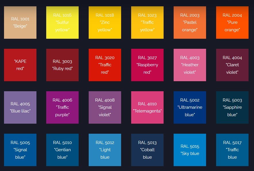Culorile RAL NU POATE fi afișate în întregime pe ecranele computerului. Culoarea depinde de monitor și imprimantă. Prin urmare, nuanța exactă a produsului poate fi diferită de cea văzută aici! Vă rugăm să utilizați aceste mostre de culoare doar ca referință! Vă recomandăm să vedeți un ghid de culori fizic și oficial RAL pentru a fi sigur de culoarea corectă.