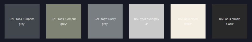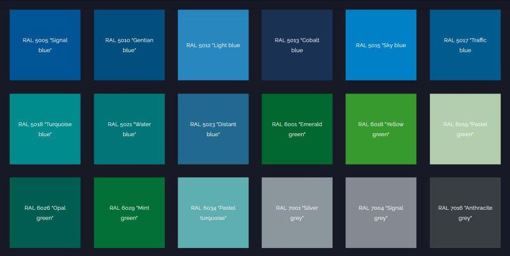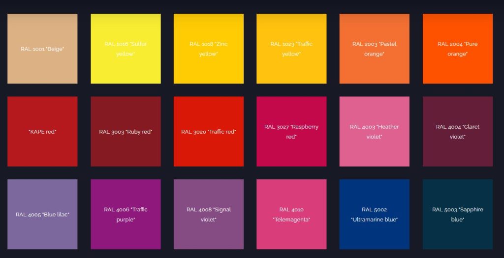 Culorile RAL NU POATE fi afișate în întregime pe ecranele computerului. Culoarea depinde de monitor și imprimantă. Prin urmare, nuanța exactă a produsului poate fi diferită de cea văzută aici! Vă rugăm să utilizați aceste mostre de culoare doar ca referință! Vă recomandăm să vedeți un ghid de culori RAL fizic și oficial pentru a fi sigur de culoarea corectă.