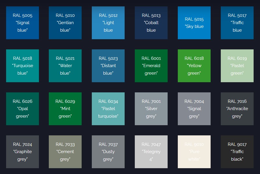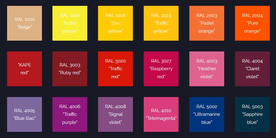 Culorile RAL NU POATE fi afișate în întregime pe ecranele computerului. Culoarea depinde de monitor și imprimantă. Prin urmare, nuanța exactă a produsului poate fi diferită de cea văzută aici! Vă rugăm să utilizați aceste mostre de culoare doar ca referință! Vă recomandăm să vedeți un ghid de culori RAL fizic și oficial pentru a fi sigur de culoarea corectă.