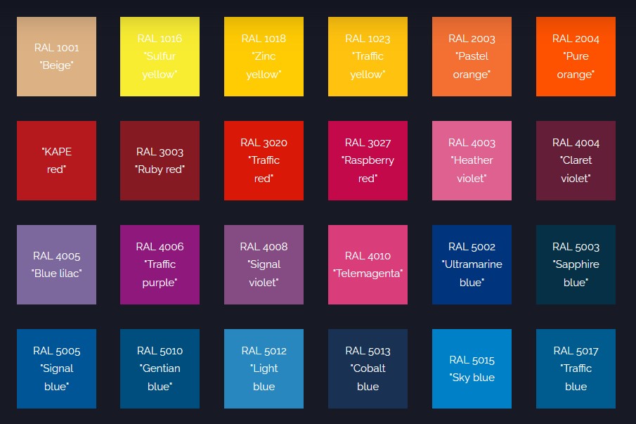Culorile RAL NU POATE fi afișate în întregime corect pe ecranele computerului. Culoarea depinde de monitor și imprimantă. Prin urmare, nuanța exactă a produsului poate fi diferită de cea văzută aici! Vă rugăm să utilizați aceste mostre de culoare doar ca referință! Vă recomandăm să vedeți un ghid de culori RAL fizic și oficial pentru a fi sigur de culoarea corectă.