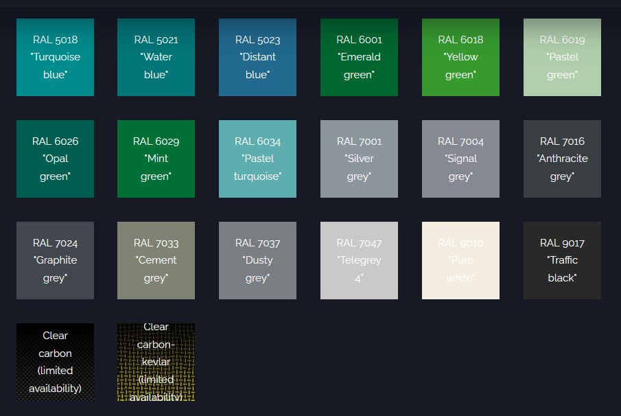 (Din cauza straturilor de gelcoat suprapuse) mai multe culori au ca rezultat o greutate mai mare.