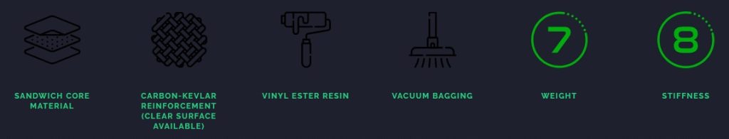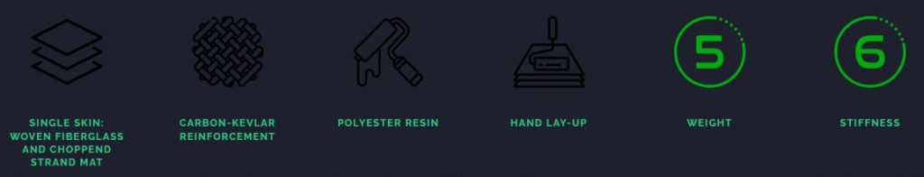 Strat economic din fibră de sticlă cu strat de întărire carbon-kevlar pentru rezistență suplimentară la impact. Durată lungă de viață, ușor de întreținut și reparat. Pentru uz hobby și recreativ.